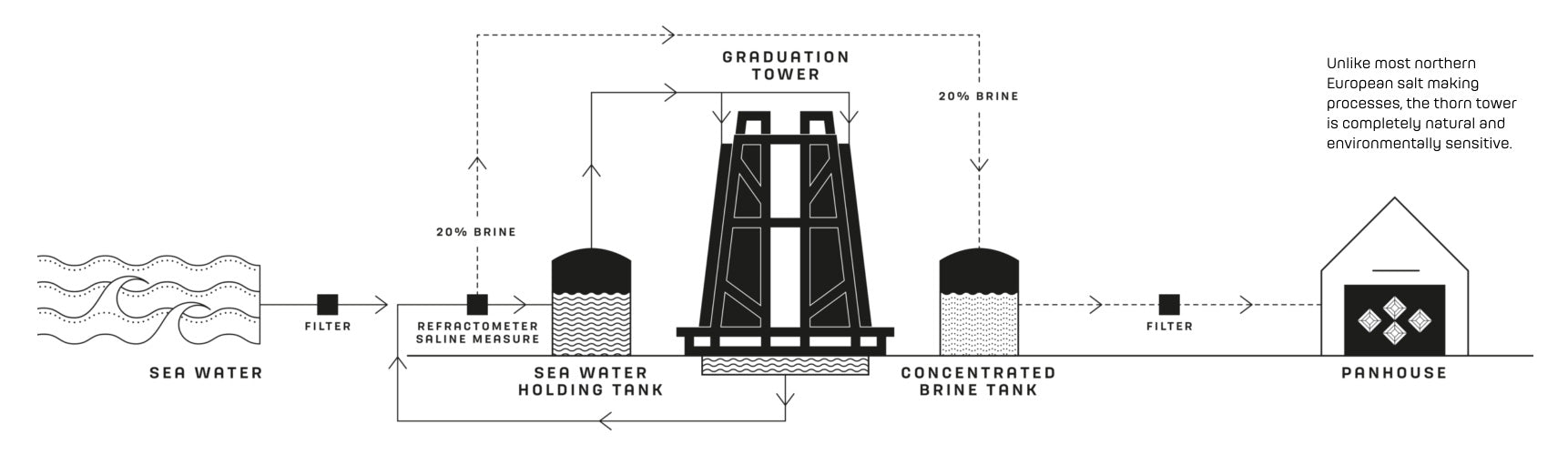The first stages of the Blackthorn journey are wild and require nothing but nature: the West Coast seas and winds. Reminiscent of a Brothers Grimm fairy tale, their imposing tower of thorns sits facing the sea and the mountains of Arran. This spiky structure is incredibly effective as well as being visually impressive: it enables a significant acceleration of the evaporation process required for sea salt production. Scottish West Coast sea water is slowly trickled through the country’s only graduation thorn tower whilst being evaporated by the exhilarating West Coast winds. The sea water is pumped to the top of the tower. Across the top of the tower are 56 wooden taps which when opened allow the sea water to move along wooden channels across the full length and breadth of the tower from where it then dribbles down through the blackthorn bushes before reaching the collection tanks at ground level. The sea water seeps along every twig and thorn, maximising exposure to the powerful and persistent coastal winds (and any sun that might be showing face). The emerging droplets partially evaporate and any remaining liquid becomes a more concentrated brine. The purpose of this process is to spread the water out as thinly as possible, over the greatest area, as the greater the surface area, then the greater the rate of evaporation. Environmental factors such as wind speed and direction, temperature and humidity all effect the evaporation process, which results in increases in salinity of the water of between 1-5% for each pass down through the tower.